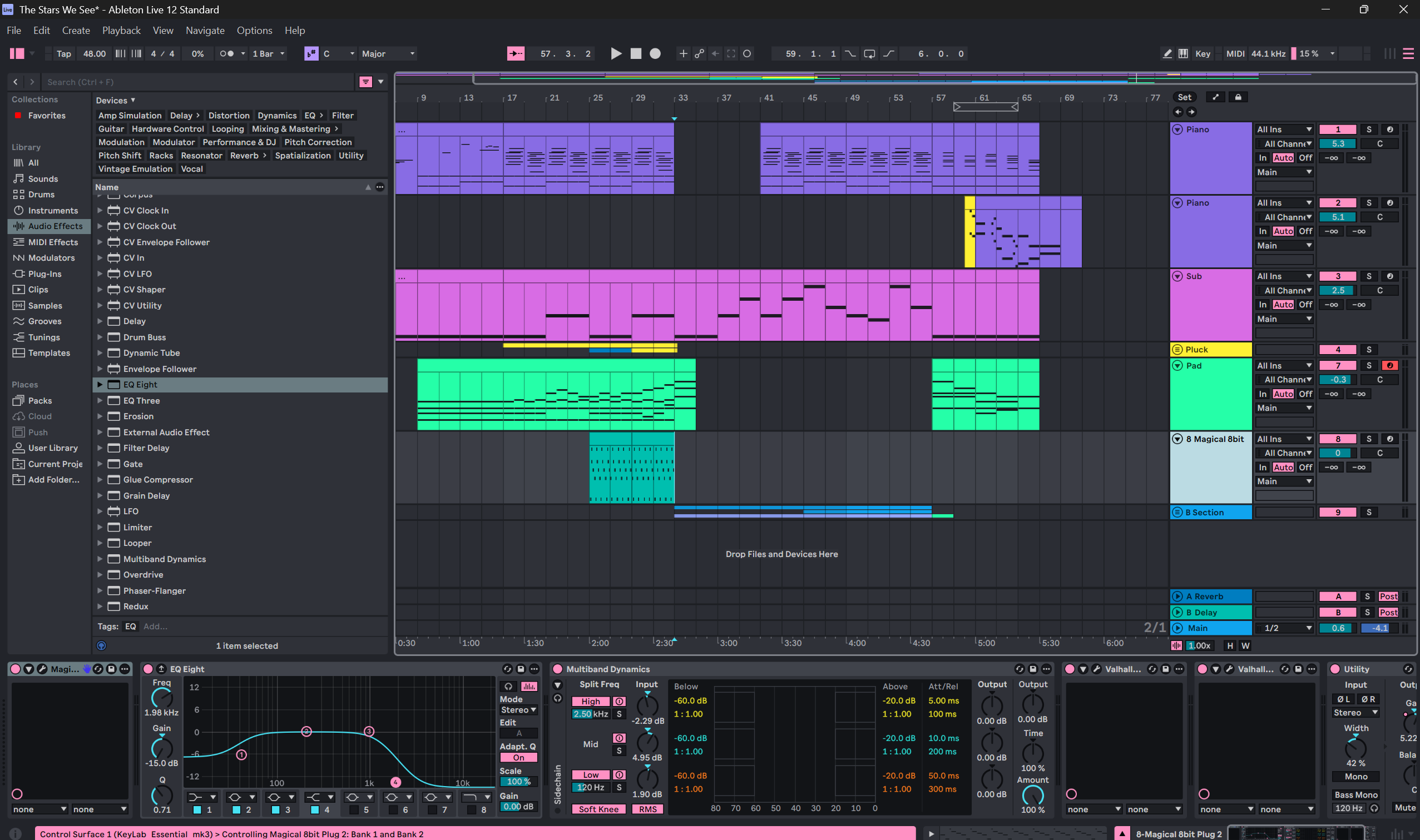 The Stars We See is a level/main theme, that I see as representing the main ideas I had when creating this concept. I wanted to encapsulate the awe and bewilderment that comes from staring at the open night sky, watching everything move slowly through the sky as stars fade in and out of existence. I focused on trying to create a timbral contrast between the back and foreground elements, like the haze of a night sky versus the brightness of the stars. A lot of the effects in this track are done via building up delay over time with extensive filter manipulation.